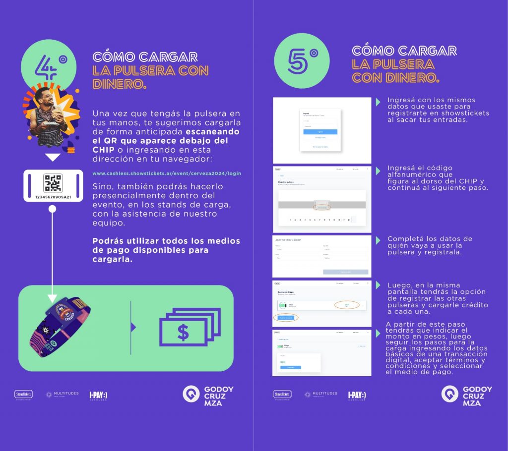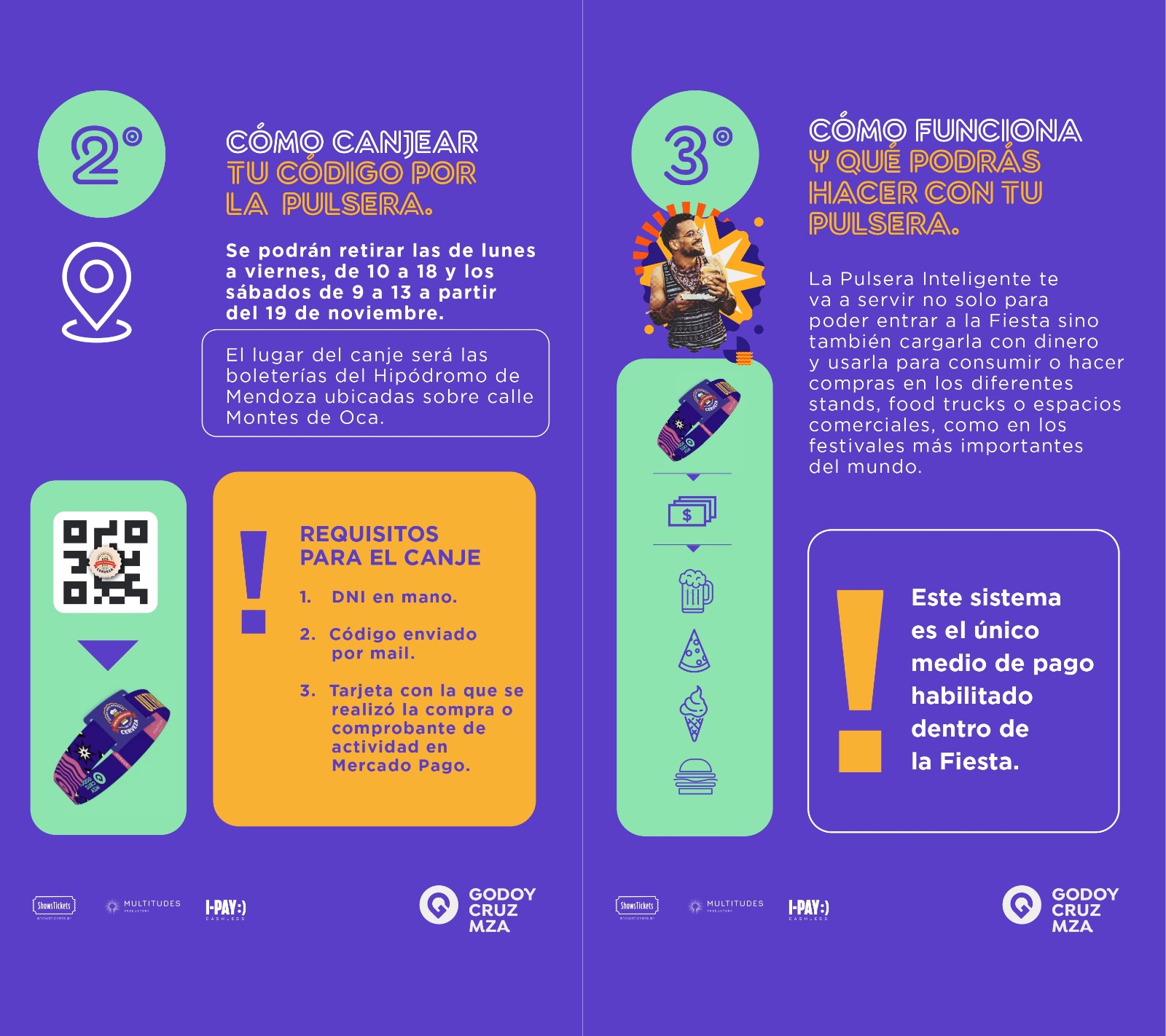 La pulsera inteligente (que tenés que retirar de lunes a viernes de 10 a 18 o sábados de 9 a 13 por las boleterías del Hipódromo tras comprar tu entrada) servirá no solo para ingresar al festival. También se utilizará para cargarla con dinero para consumir o hacer compras en los food trucks, stands o espacios comerciales.