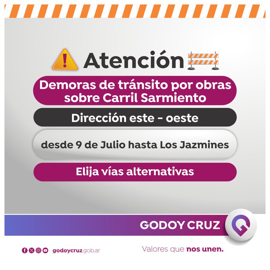 Se presentarán demoras de tránsito sobre la calle Sarmiento, entre 9 de Julio y Los Jazmines. Esto es debido a obras que se están realizando en el lugar