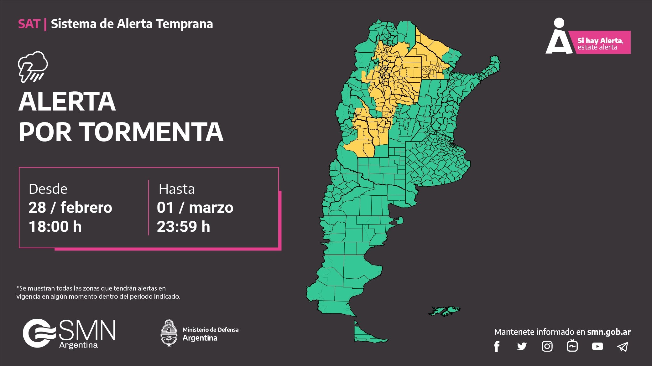 El Sistema de Alerta Temprana (SAT) es una herramienta del Servicio Meteorológico Nacional (SMN). El mismo proporciona a la sociedad un sistema de información gráfica por color sobre amenazas meteorológicas potenciales y su vigilancia en https://www.smn.gob.ar/alertas.
