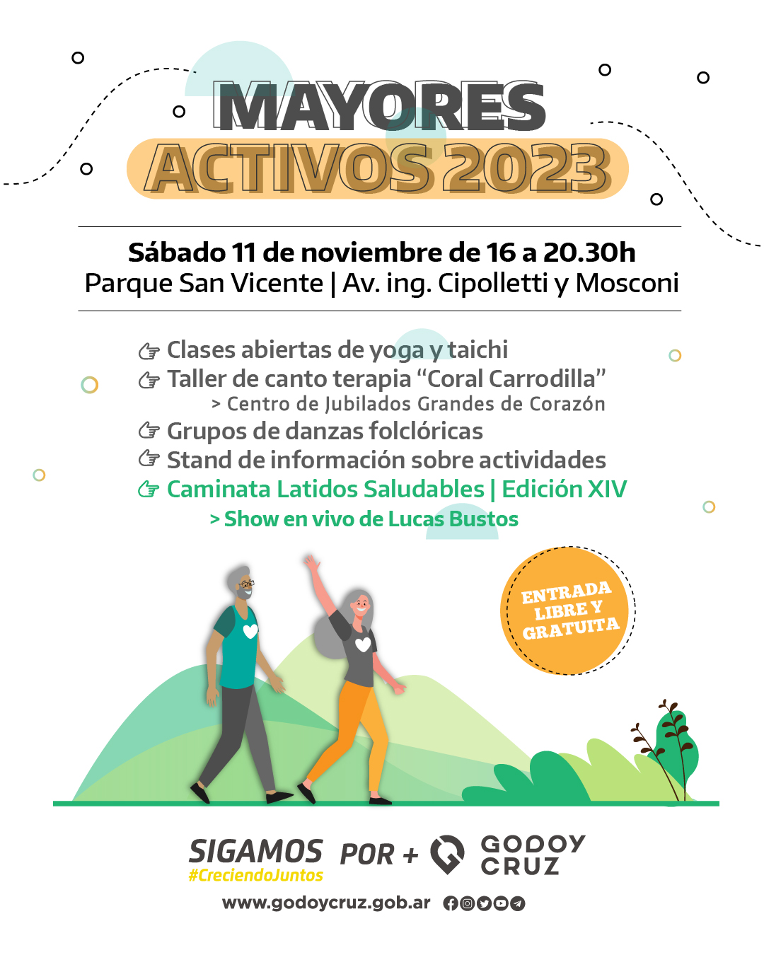 El sábado 11 de noviembre, a las 16, en el Parque San Vicente, se realizará una serie de actividades. Con entrada libre y gratuita, las mismas tienen como objetivo destacar el rol activo de las personas mayores