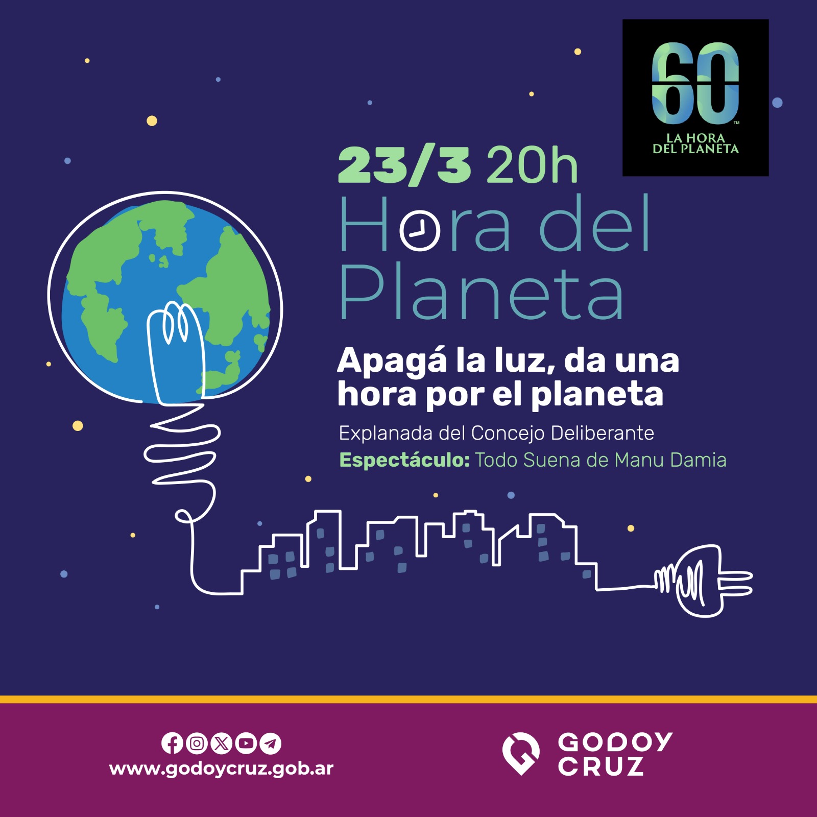 En este contexto, Godoy Cruz invitó el sábado 23, a partir de las 20, a los jardines del Concejo Deliberante. En Rivadavia 448, entre las 20:30 y las 21:30, se llevará a cabo el apagón. Estará acompañado por el ritmo del multinstrumentista Manu Damia y su espectáculo Todo Suena.