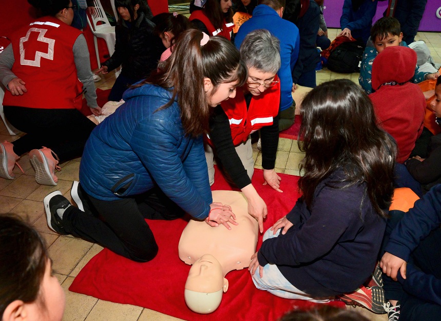 Los representantes de la Cruz Roja enseñaron a los niños y niñas técnicas básicas de reanimación cardiopulmonar (RCP) y primeros auxilios. Se les mostró cómo usar un botiquín de primeros auxilios, una tabla rígida y otros equipos importantes. De esta manera, se proporcionó una experiencia práctica que puede ser vital en situaciones de emergencia.
