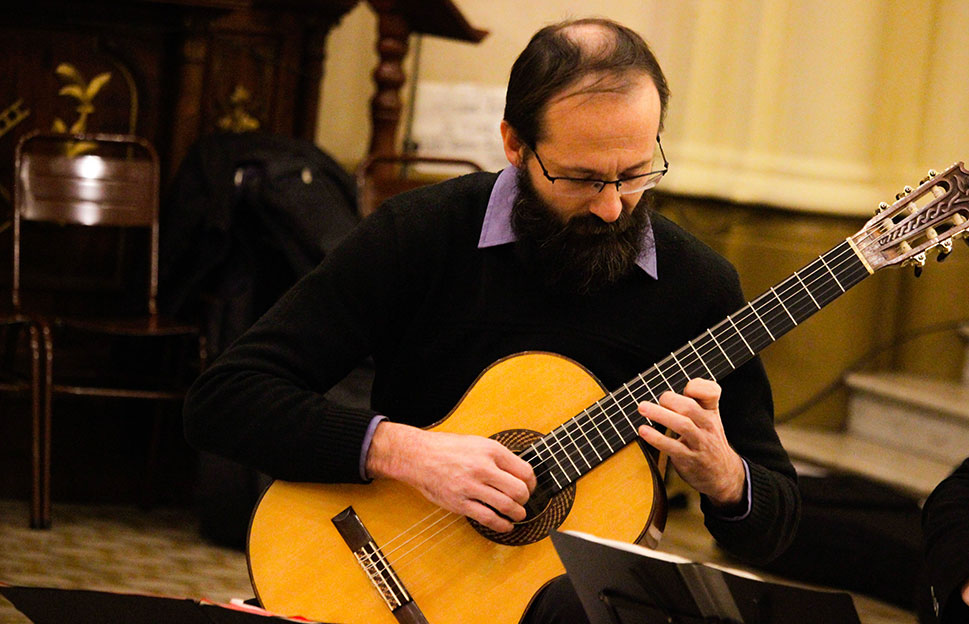 David Bajda templando las cuerdas.