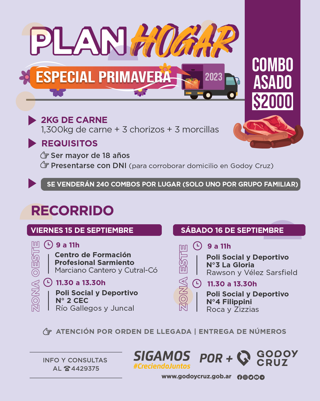 El Programa Plan Hogar ofrecerá un combo a 2000 pesos que incluye 1,300 kg de asado, 3 morcillas y 3 chorizos. El mismo se ofrecerá el viernes 15 y el sábado 16, a lo largo de un recorrido especial por diferentes puntos del Departamento.