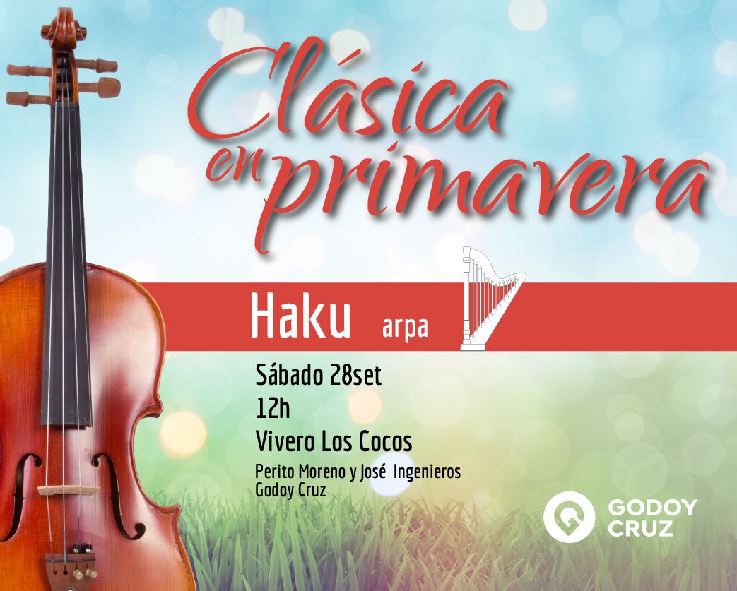 12H. Vivero Los Cocos. Perito Moreno y José Ingenieros, Godoy Cruz. Actuación de Jorge Castillo “Haku” (arpa).
