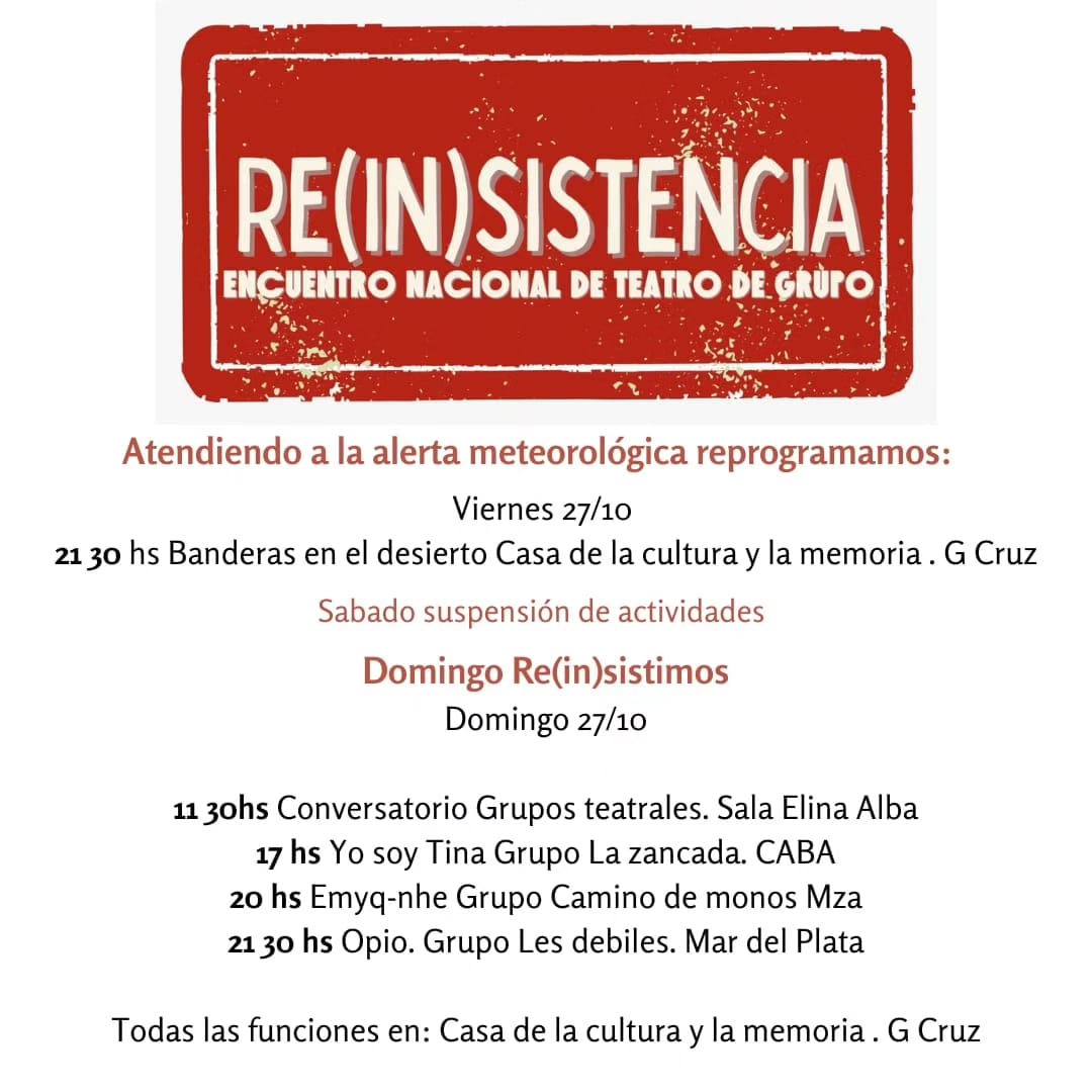 Debido a las fuertes ráfagas pronosticadas en la provincia por viento zonda, las actividades del Encuentro Nacional de Teatro en Grupo se reprograman para el día 29 de octubre.