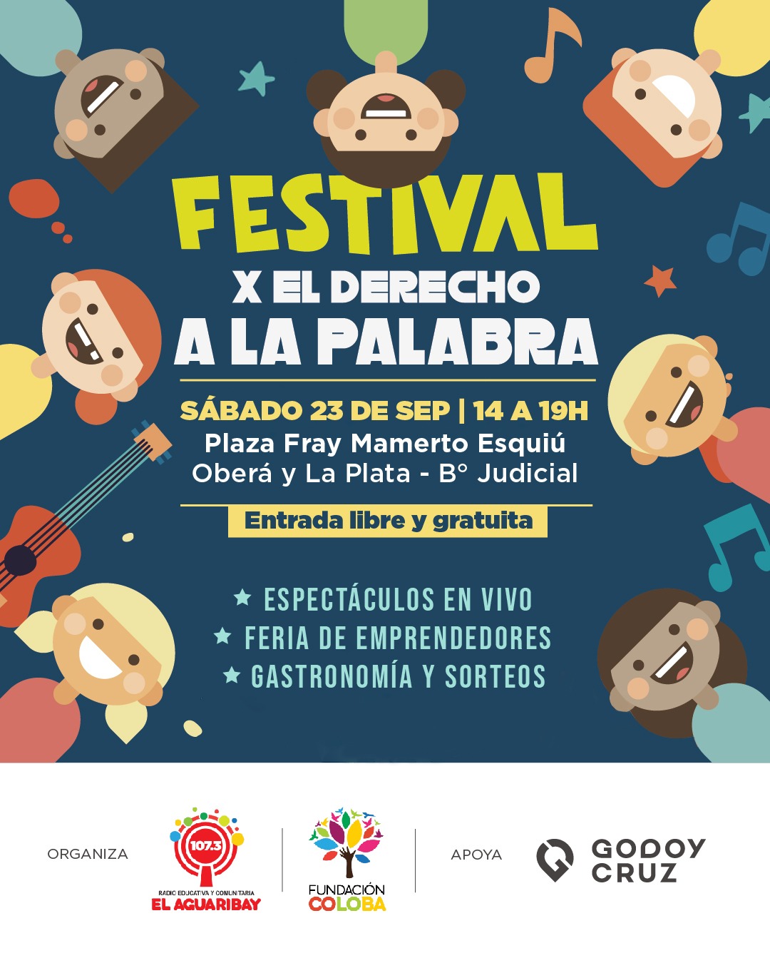 El Festival por el Derecho a la Palabra 2023 se realizará el sábado 23, de 14 a 19, en la Plaza Fray Mamerto Esquiú. Habrá espectáculos en vivo, feria de emprendedores, gastronomía y sorteos, con entrada libre y gratuita