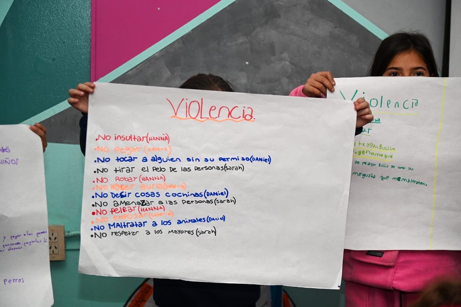 Posteriormente, participaron en actividades dinámicas. Éstas incluyeron la visualización de un video sobre violencia y bullying, una rueda de resolución de conflictos y una producción gráfica. La idea principal fue conectar con la calma en situaciones conflictivas.