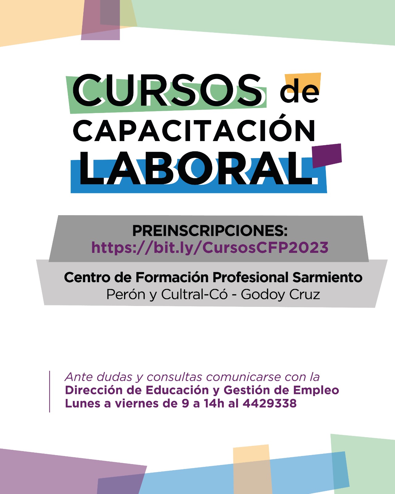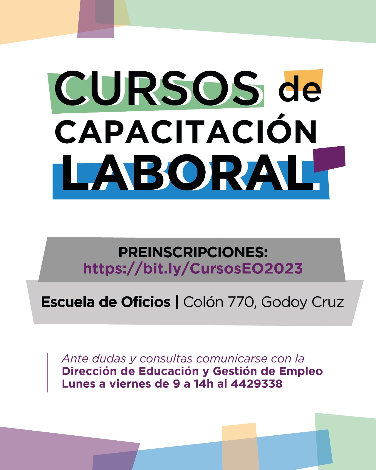 Ante dudas o consultas, comunicarse con la Dirección de Educación y Gestión de Empleo al 4429338. El horario es de lunes a viernes, de 9 a 14.