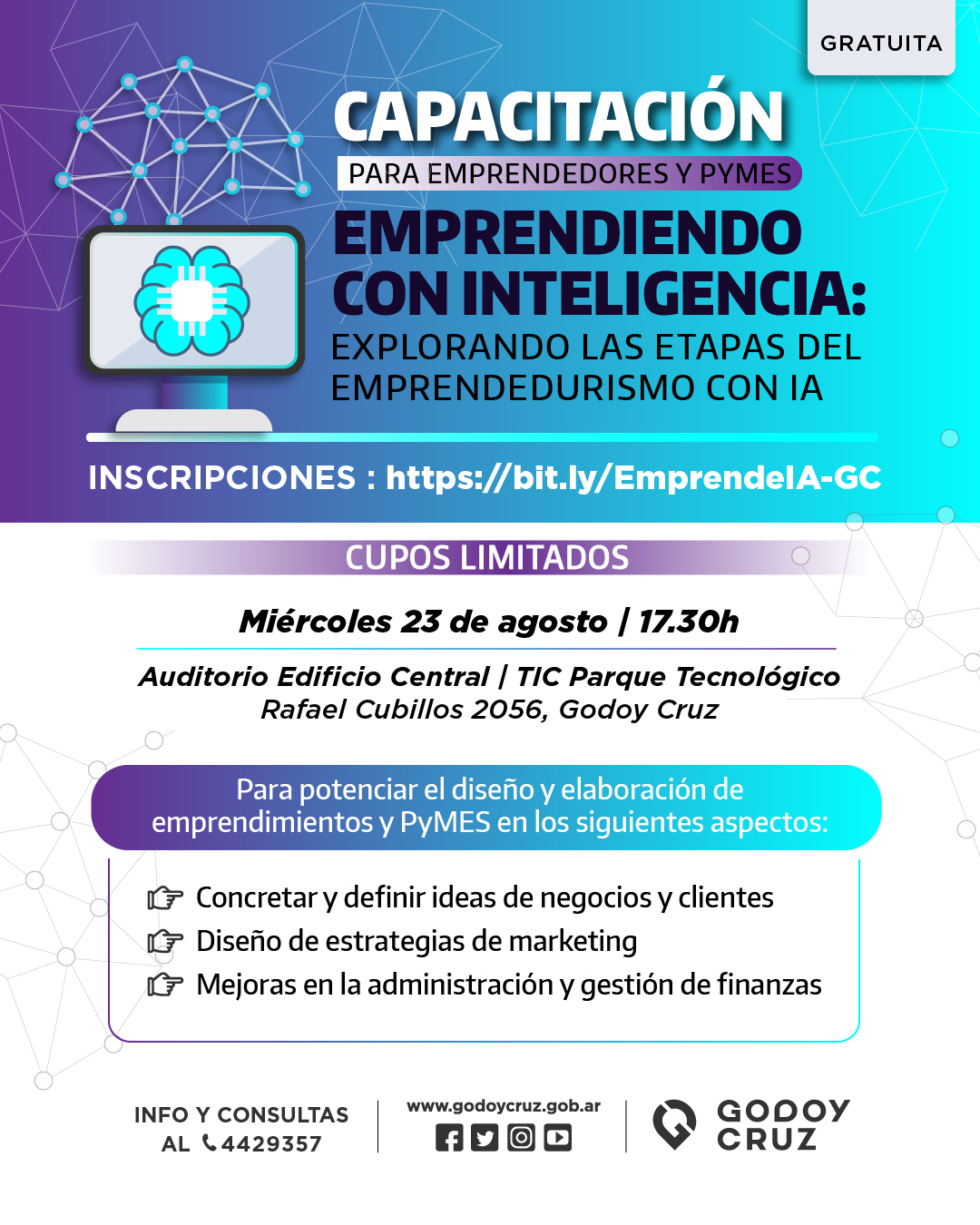 El curso se dictará el 23 de agosto, a las 17:30, en el Parque Tecnológico. Quienes deseen participar deberán inscribirse online en Emprendedores IA