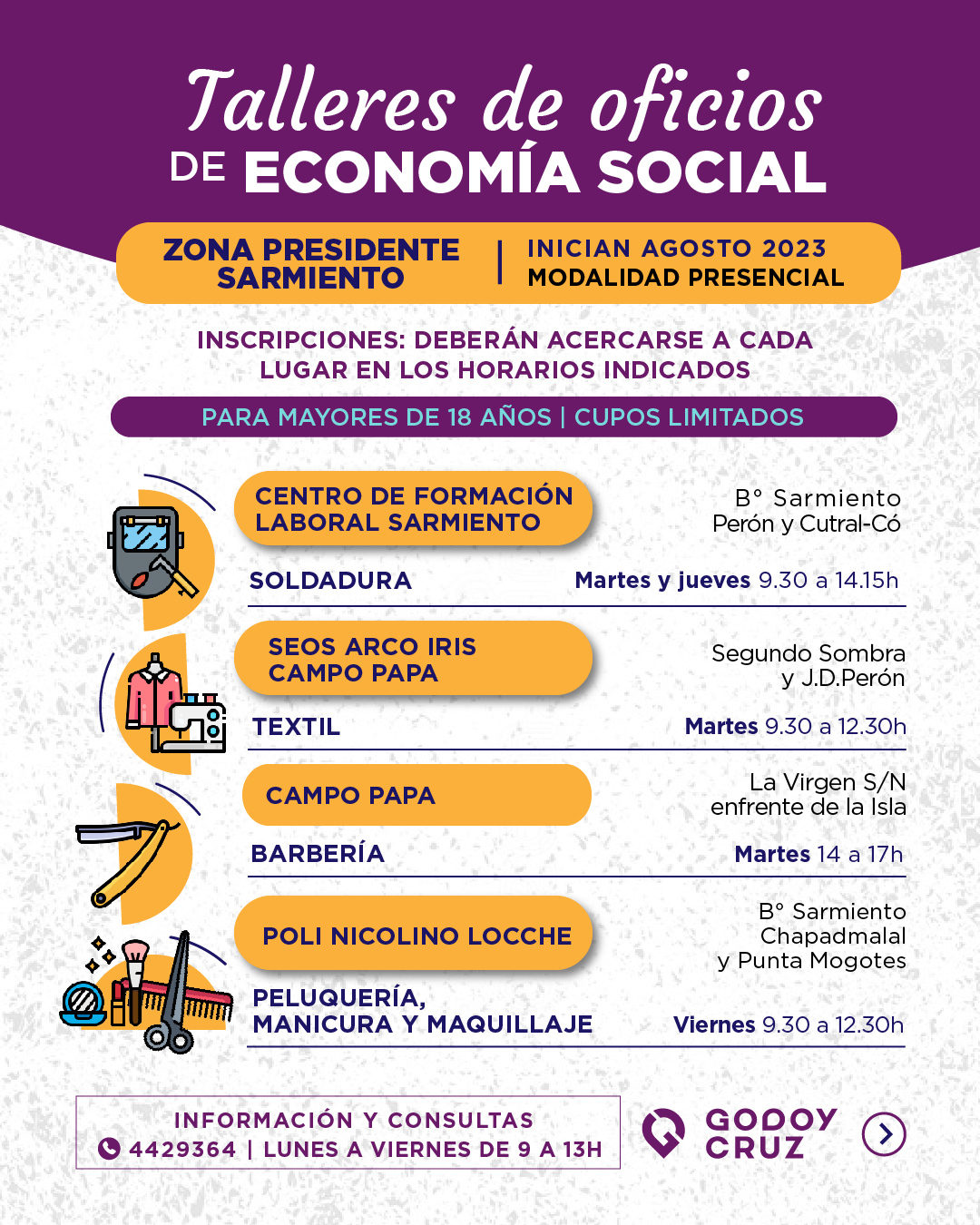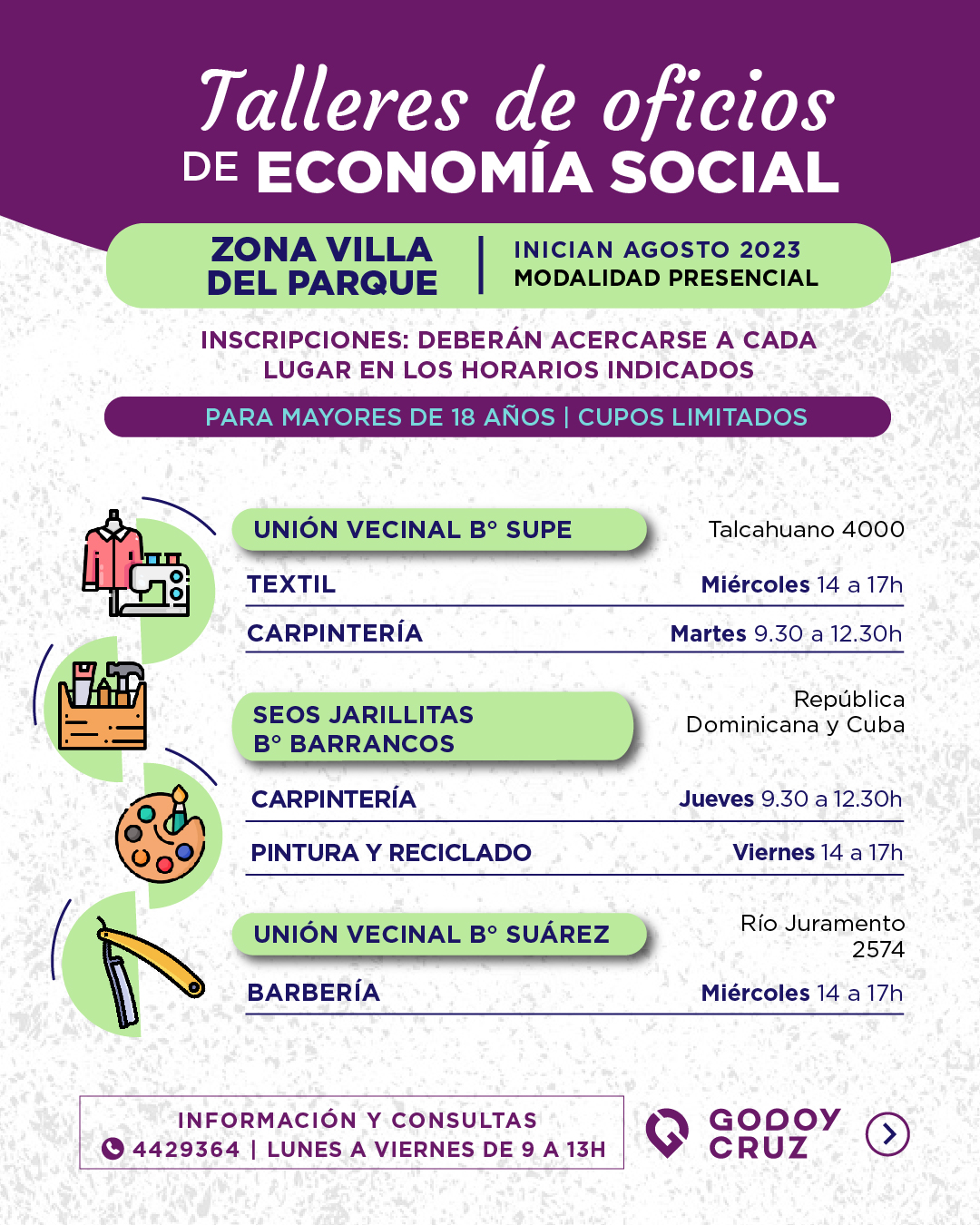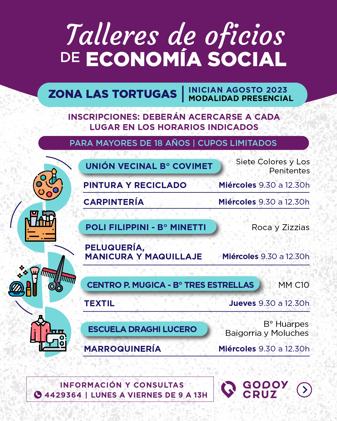 Estas propuestas tendrán una duración de 5 meses aproximadamente, según el taller. A la finalización, se darán certificados. De esta forma, habrá trece sitios para asistir y tienen cupos limitados. Es por eso que quienes estén interesados en participar deberán tener domicilio en Godoy Cruz. Además, deberán acercarse a los lugares y en los horarios donde se dictan los talleres, con DNI y fotocopia.