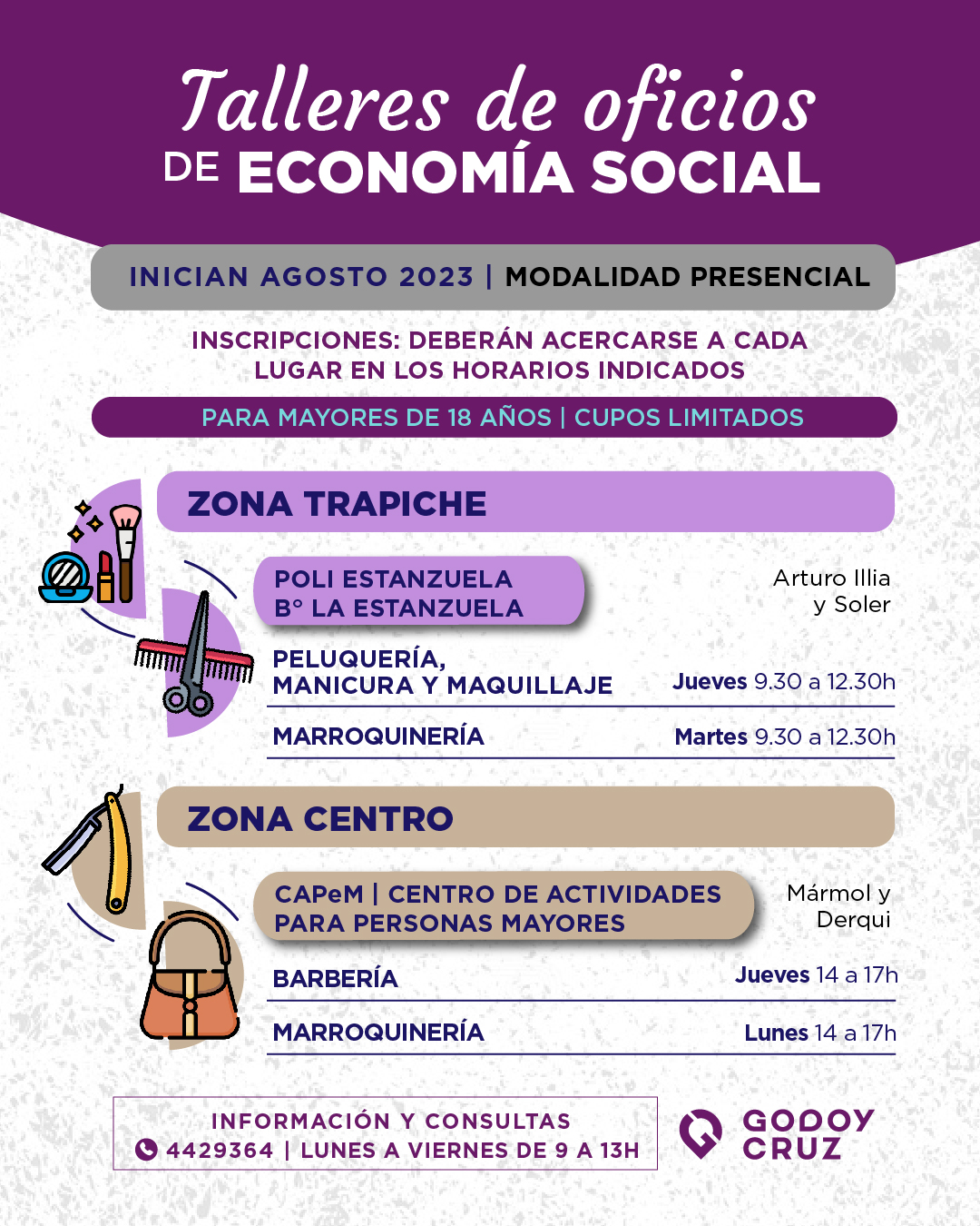 Siguiendo con el cronograma, habrá otras opciones en el Poli Social y Deportivo La Estanzuela, Arturo Illia y Soler, B° Dolores Prat de Huisi. Por un lado, los jueves de 9:30 a 12:30 habrá peluquería, manicura y maquillaje. Mientras que los martes se dará marroquinería de 9:30 a 12:30.