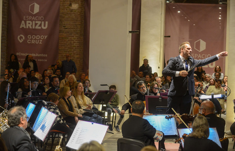 A sala llena, el Espacio Arizu volvió a convertirse en el escenario de este particular concierto, donde el público pudo sumergirse en diferentes piezas musicales sentados entre los instrumentos y músicos de la Orquesta Sinfónica de la UNCuyo.