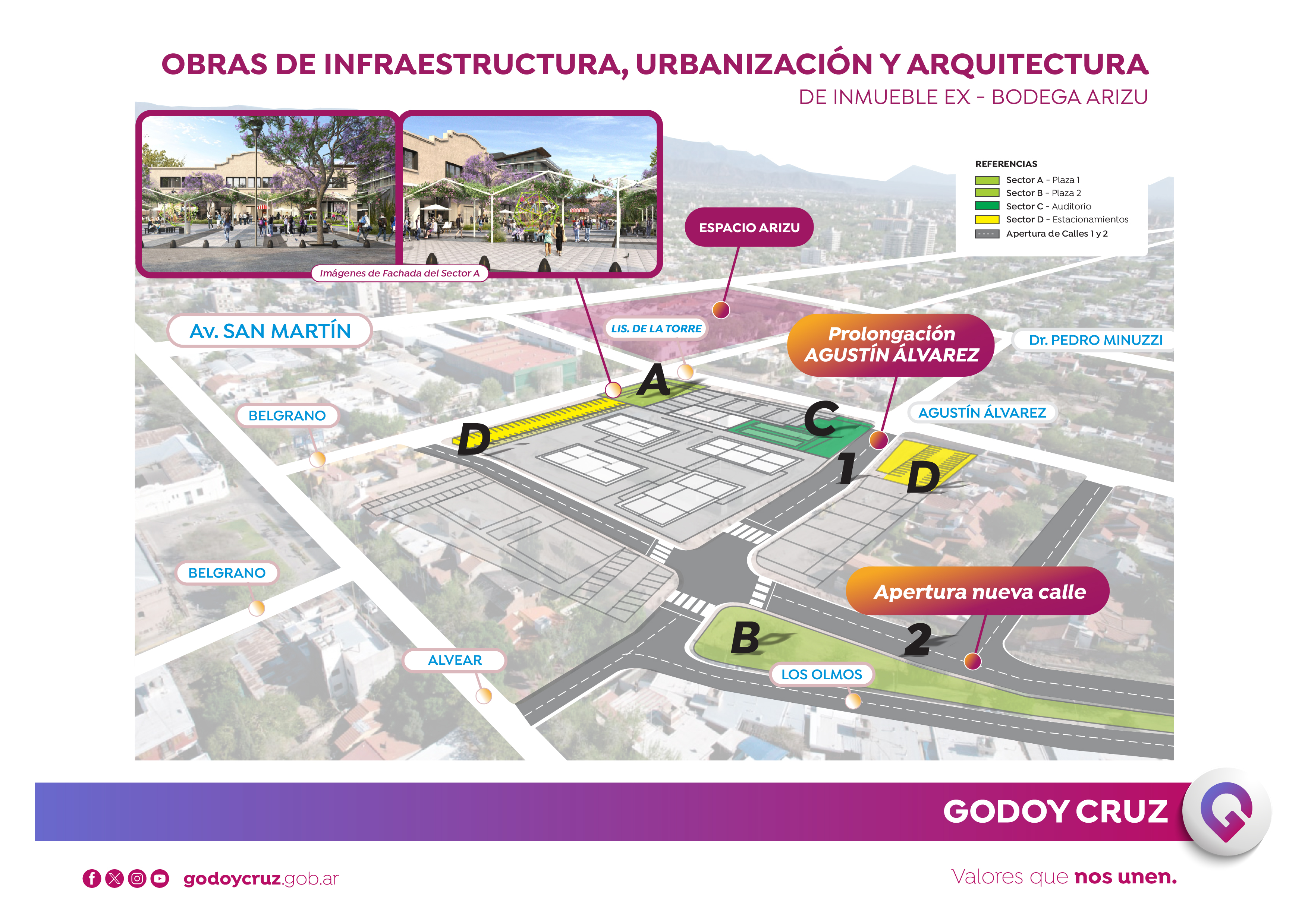 Por otra parte se abrirá Arizu, desde Belgrano hasta la prolongación de Agustín Álvarez. Continuará hacia el Este hasta la intersección con Los Álamos. Asimismo, quedará ubicada en paralelo a Los Olmos, sobre la antigua traza del ramal de ferrocarril que ingresaba a la Bodega Arizu. Se ofrecerá además una nueva circulación y acceso a las calles Bardas Blancas y Los Molles.