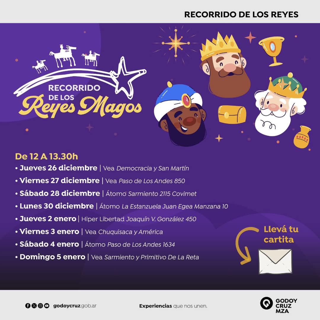 En los días previos a la histórica Cabalgata de los Reyes Magos y hasta el mediodía del 5 de enero, Melchor, Gaspar y Baltasar recorrerán diferentes puntos comerciales de Godoy Cruz.