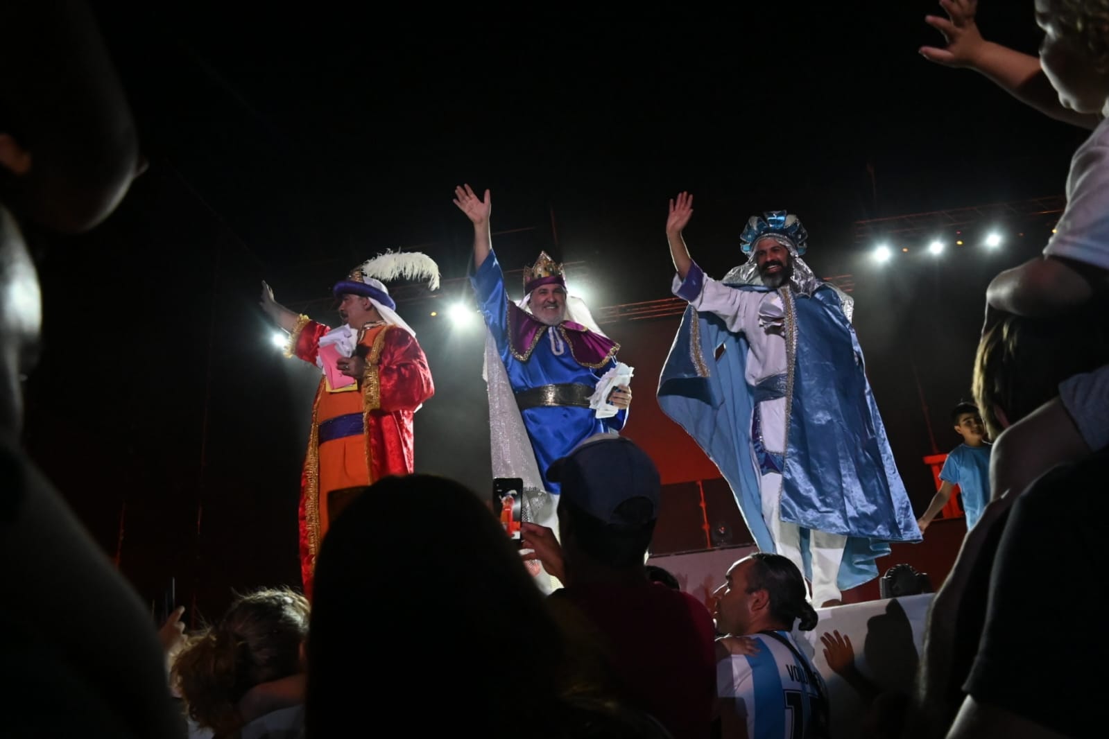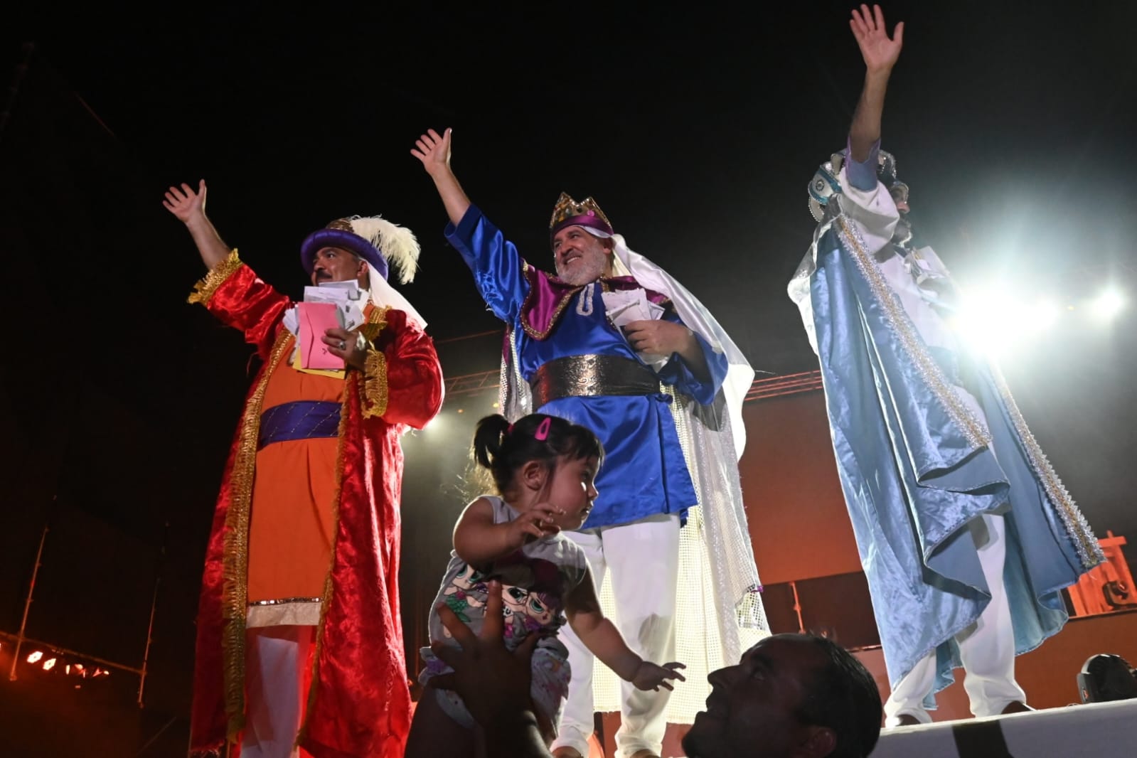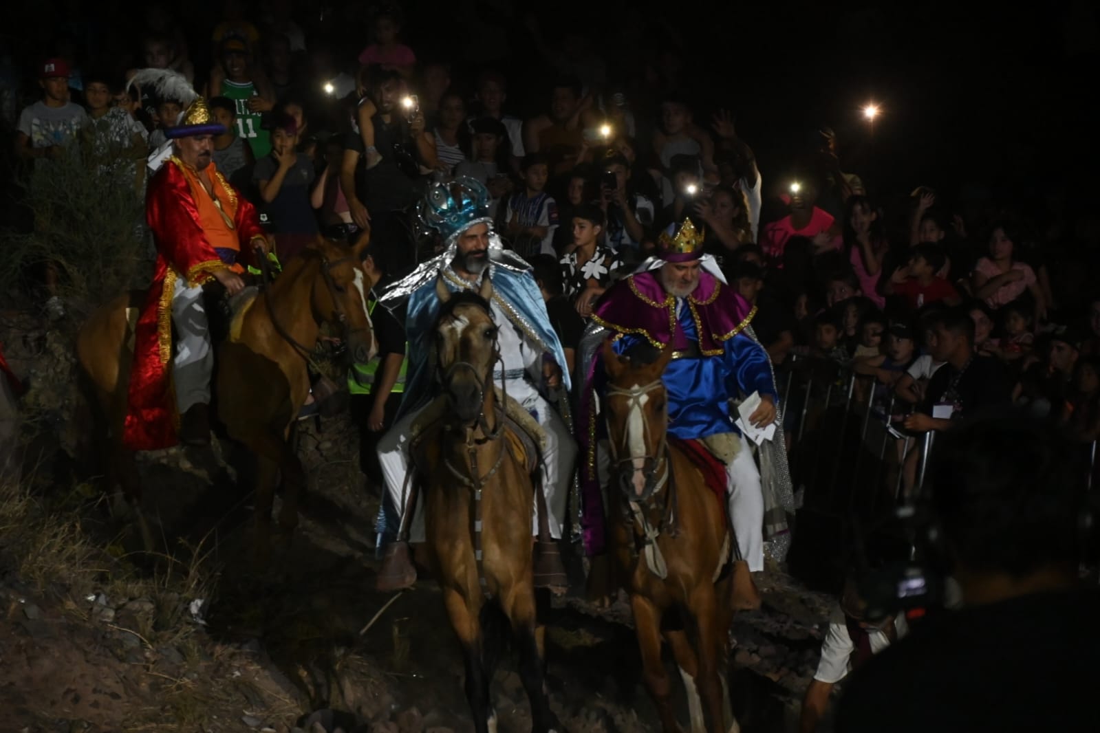 En los momentos culminantes de la puesta, los cerros mostraron a los tres grandes protagonistas de la velada. Los Reyes Magos comenzaron su descenso, recibiendo a su paso el inmenso afecto y las cartas de miles de pequeños con sus deseos.