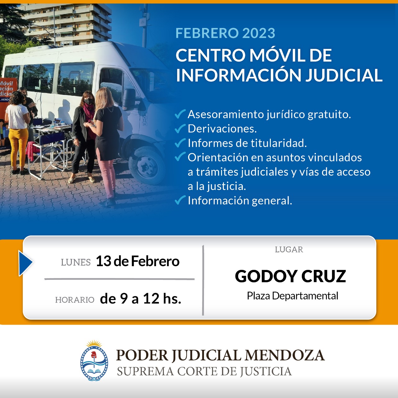 Brinda asesoría jurídica gratuita en temas de civil, familiar, penal, laboral, registral, previsional y violencia de género. Además el móvil cuenta con profesionales abogados, escribanos, codefensores civiles y de familia.