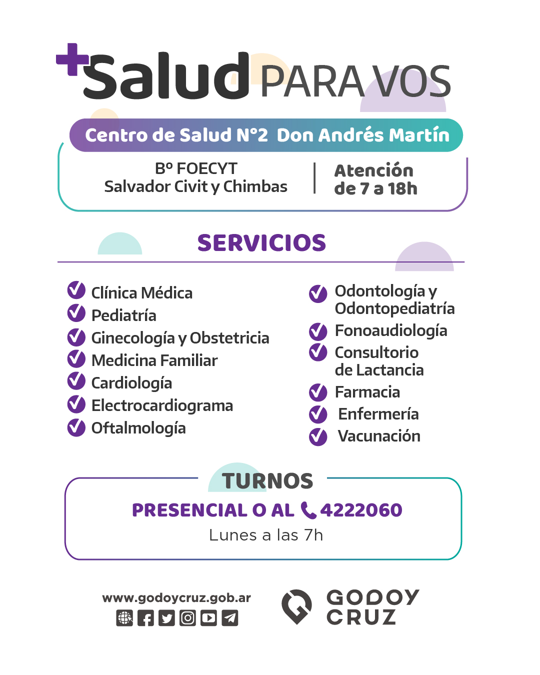 Mientras que el Nº 2, está ubicado en Salvador Civit y Chimbas, del Barrio FOECYT. Allí se brinda atención de clínica médica, pediatría, ginecología y obstetricia, medicina familiar, cardiología, electrocardiograma, oftalmología, odontología y odontopediatría. También fonoaudiología, consultorio de lactancia, farmacia, enfermería y vacunación.