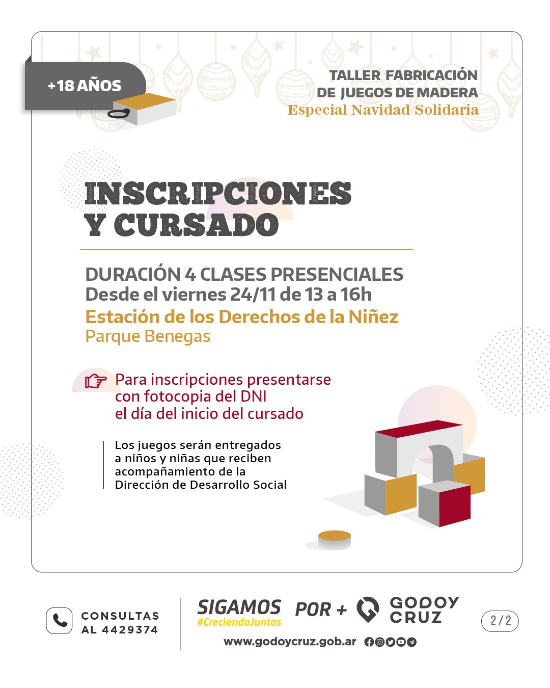 Así, quienes se inscriban aprenderán a fabricar juegos tradicionales como tablitas mágicas, trompo, tangram, yo-yo, tateti y jenga. Luego, deberán donar uno de los juegos fabricados a niños y niñas que reciben acompañamiento Institucional. Es que el Departamento de Familia, Niñez, Adolescentes y Personas Mayores colaborará con los materiales y herramientas necesarias para la fabricación de los juegos. Por su parte, los talleristas de carpintería se sumarán a esta cruzada solidaria y realizarán previamente el cortado del material.