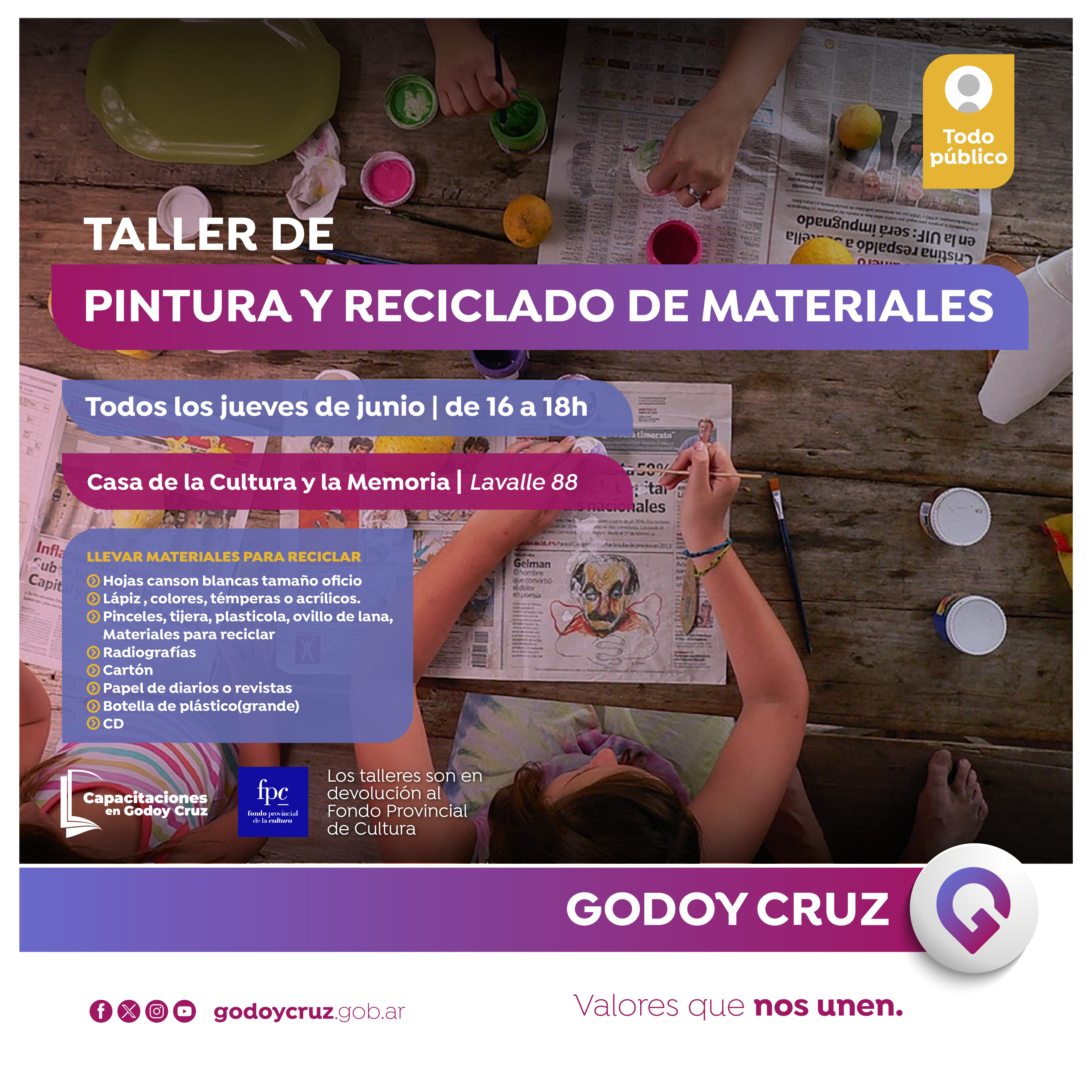 En la Casa de la Cultura y la Memoria, ubicada en Lavalle nº88, se dictará un nuevo taller de Pintura y Reciclado de materiales, el cual combina arte y sostenibilidad. El mismo inicia el jueves 6 y continuará todos los jueves de junio (13,20 y 27), de 16 a 18h.