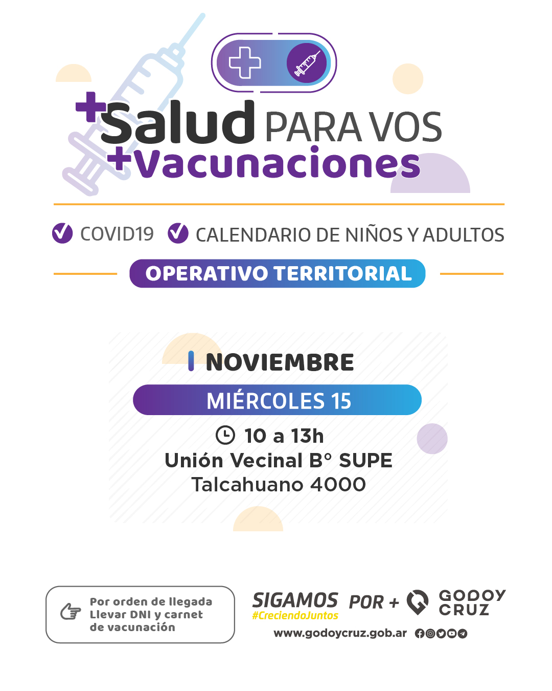 En el marco de la campaña Más Salud para Vos, el miércoles 15 se realizará un operativo de vacunación. Es por eso que el encuentro será en la Unión Vecinal del barrio SUPE, Talcahuano 4000, de 10 a 13.