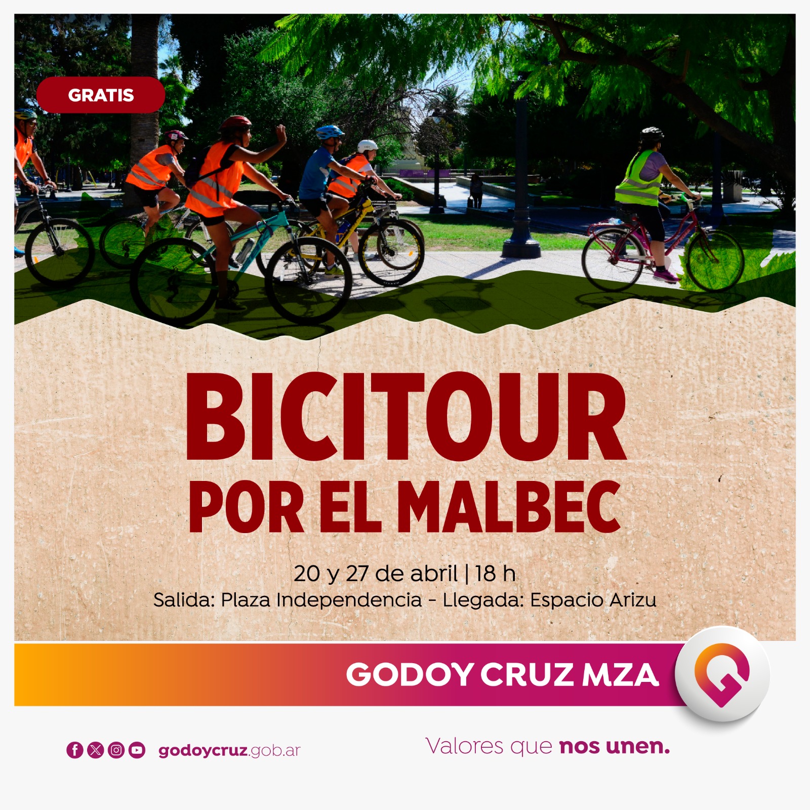 El sábado 27 se realizará la segunda edición del Bicitour Especial por el Mes del Malbec. El recorrido será por la Ciudad de Mendoza y por Godoy Cruz. Y tendrá como punto de partida la Plaza Independencia, a las 18