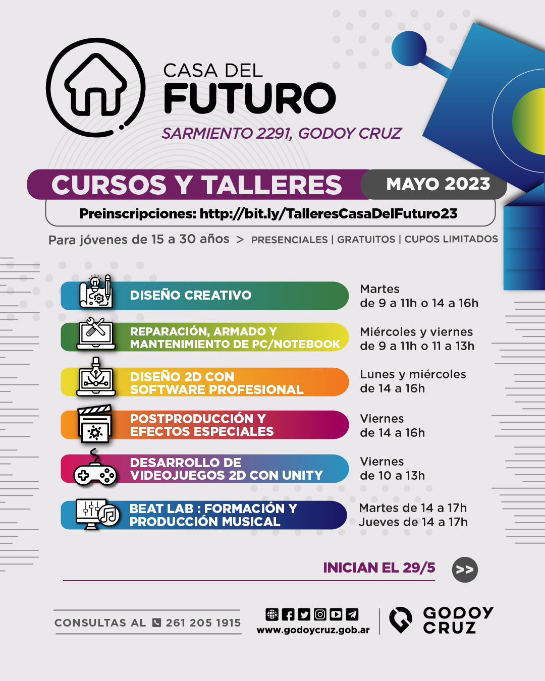 Los cursos inician el lunes 29 en la Casa del Futuro, ubicada en Sarmiento 2291. Tienen una duración aproximada de 2 meses, se entrega certificado de asistencia y aprobación. Están destinados a mayores de 15 años y son gratuitas, presenciales y con cupo limitado. Las personas interesadas en sumarse deberán preinscribirse en Talleres Casa Del Futuro 23.