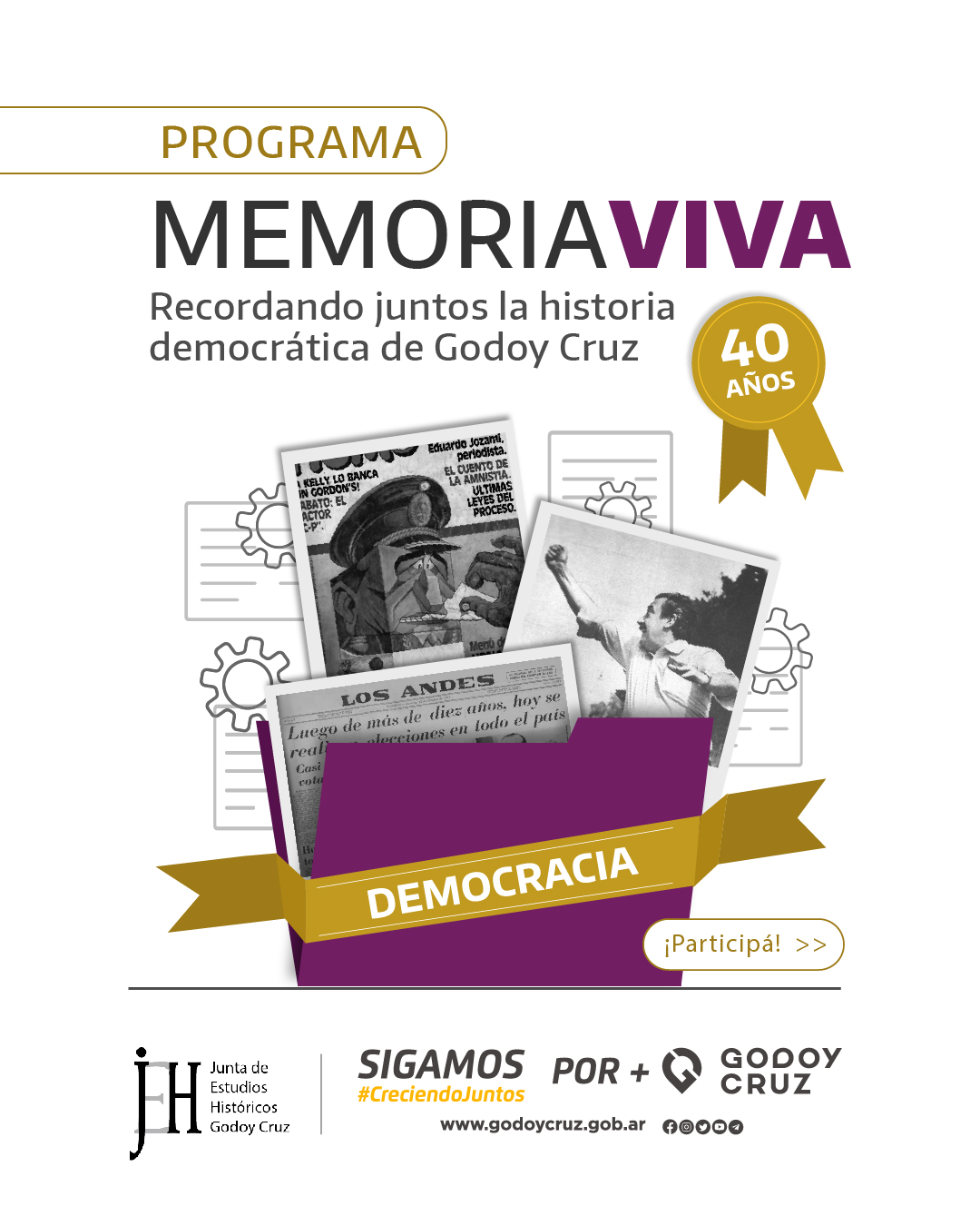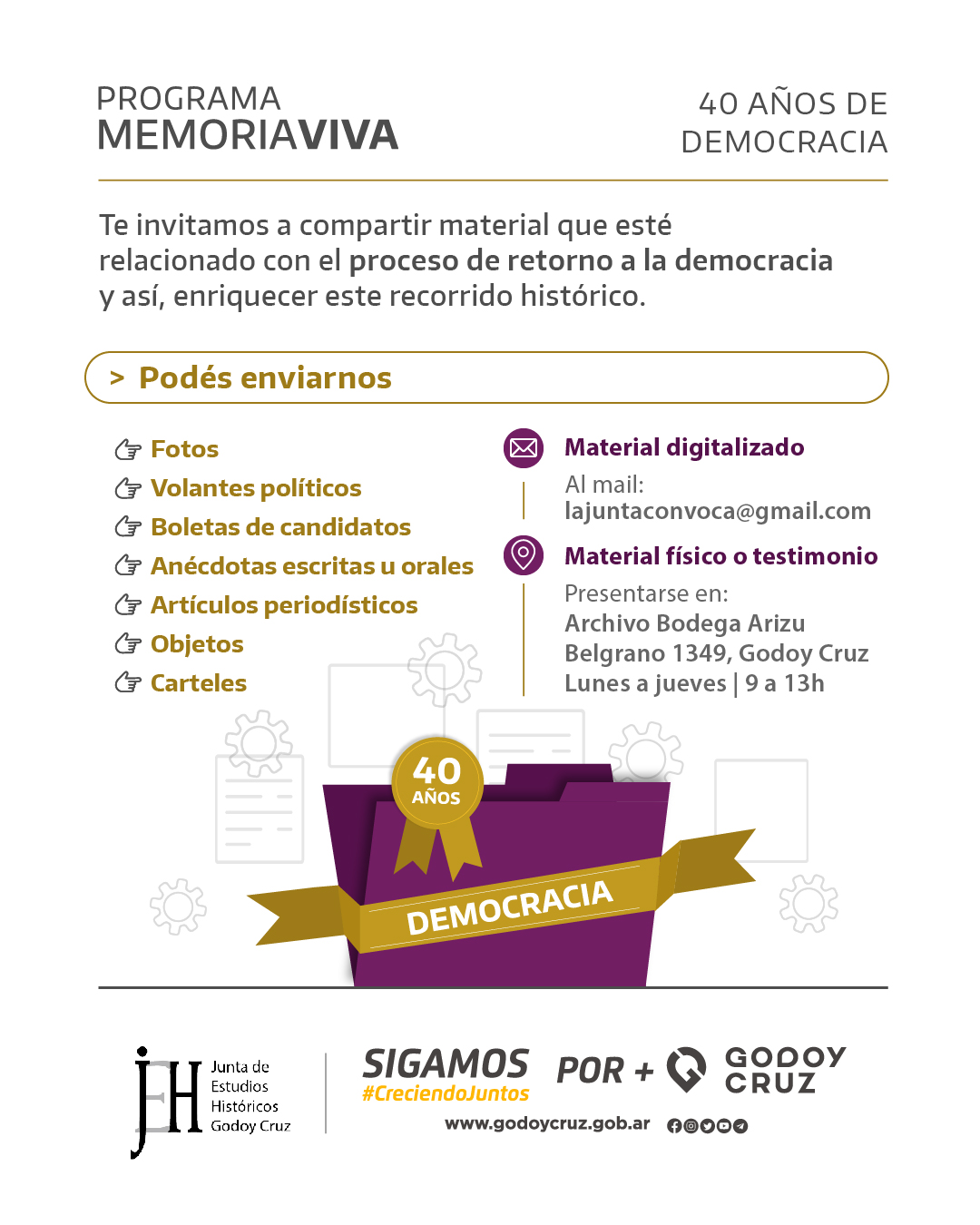 La Junta de Estudios Históricos y la Muni invitan a los vecinos y vecinas a rescatar la memoria. Así, podrán enviar fotos, volantes políticos, boletas de candidatos, carteles, artículos periodísticos, objetos y anécdotas de aquella época. De esta manera, se apela a recuperar elementos que documenten Godoy Cruz en 1983 y su contexto electoral.