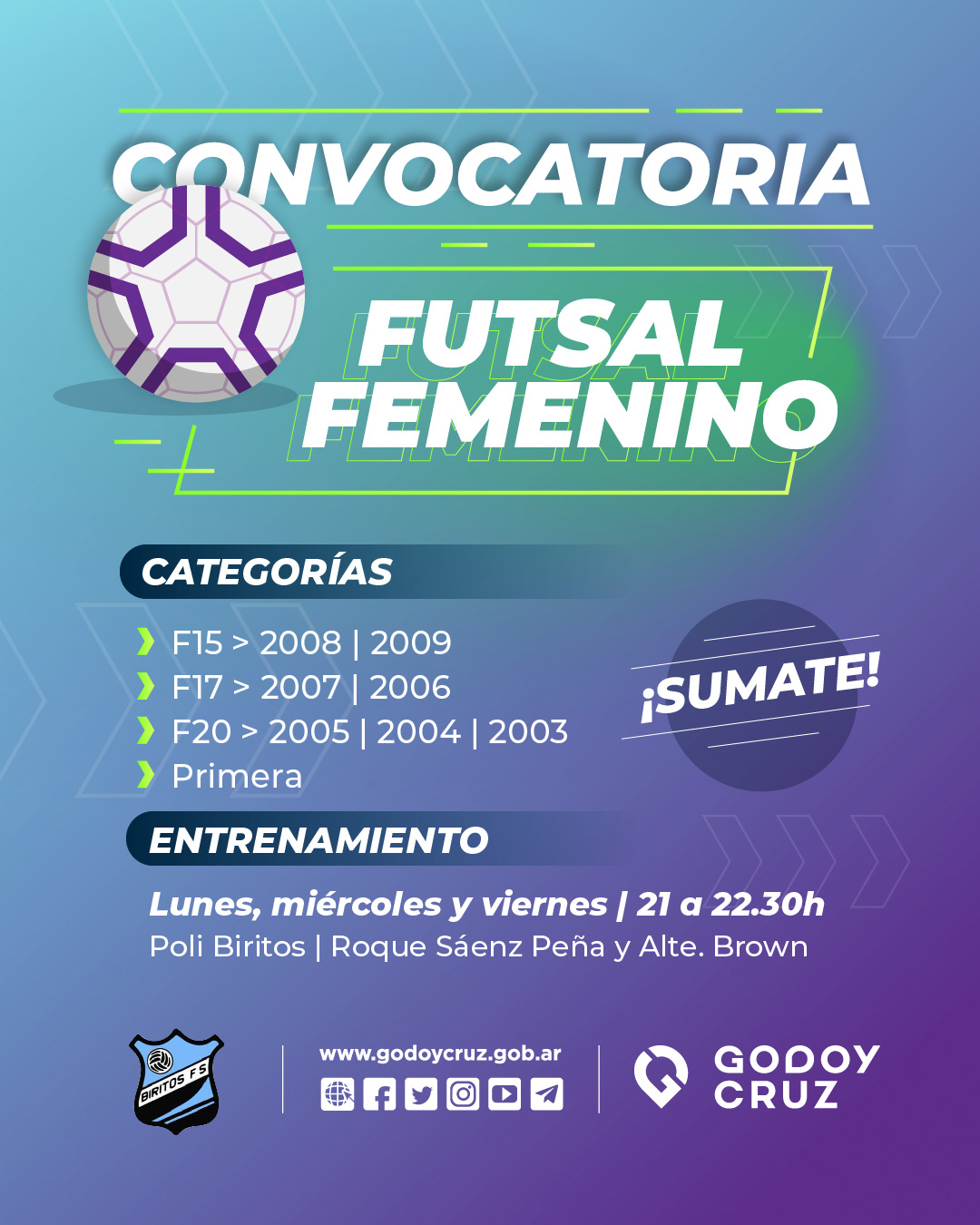 Las deportistas interesadas podrán acercarse al Poli Nº 1, ubicado en Roque Sáenz Peña y Biritos. Los días de entrenamiento son los lunes, miércoles y viernes, de 21 a 22:30.