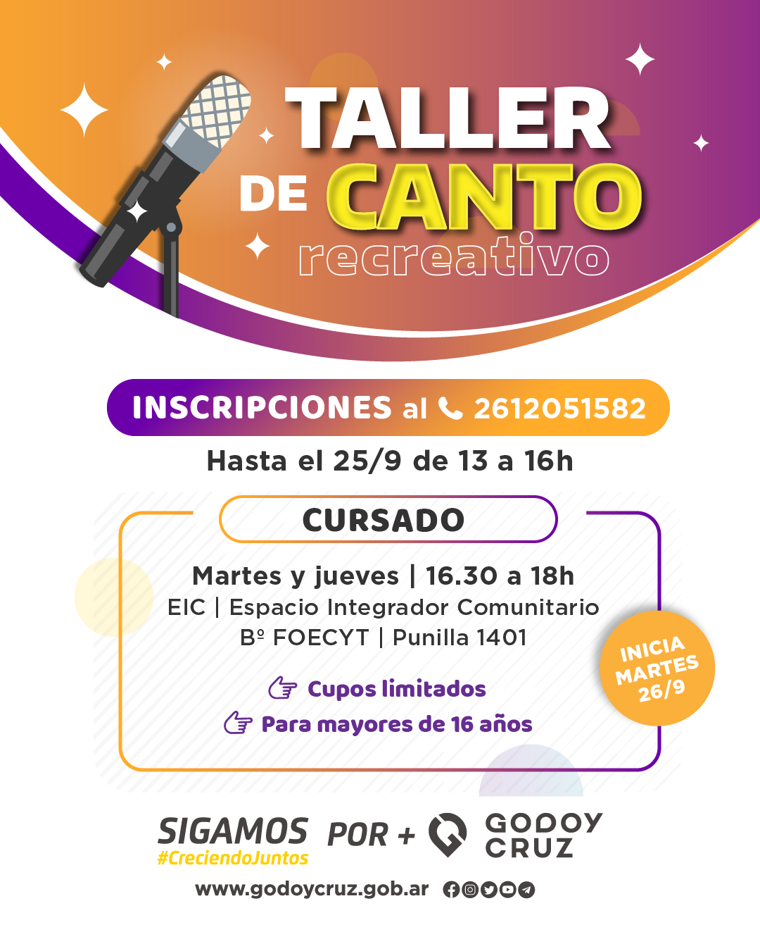 Todos los martes y jueves, de 16:30 a 18, las personas interesadas podrán aprender a cantar en el EIC. Para inscribirse, deberán llamar al teléfono 2612051582