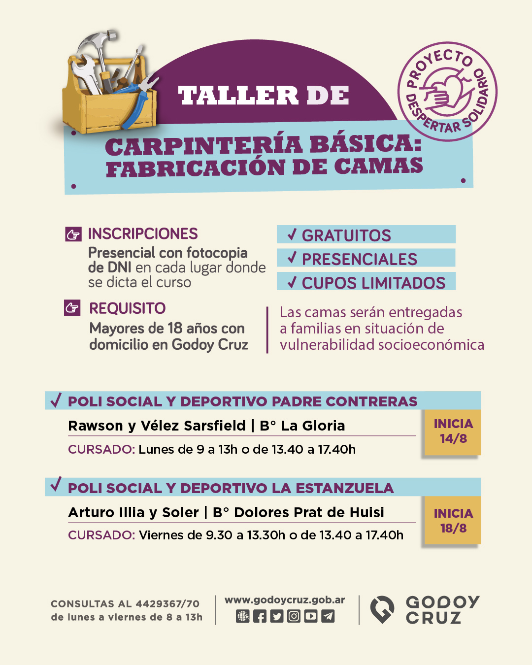 La convocatoria está destinada a mayores de 18 años que tengan domicilio en Godoy Cruz. Siempre que tengan la intención de aprender un oficio para emprender y trabajar. Quienes estén interesados en inscribirse deberán acercarse de manera presencial a los lugares y en los horarios donde se dictan los talleres, con DNI y fotocopia.
