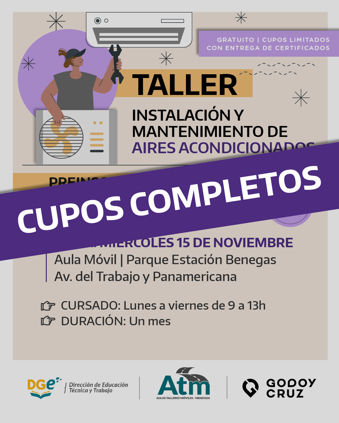 El taller de instalación y mantenimiento de aires acondicionados será gratuito y se cursará de lunes a viernes, de 9 a 13. El lugar de reunión está en el Parque Benegas, y es para residentes en Godoy Cruz mayores de 18 años. Esta propuesta tendrá una duración de un mes y quienes estén interesados deberán inscribirse de manera online. Luego, se contactarán por mail para confirmar el cupo.