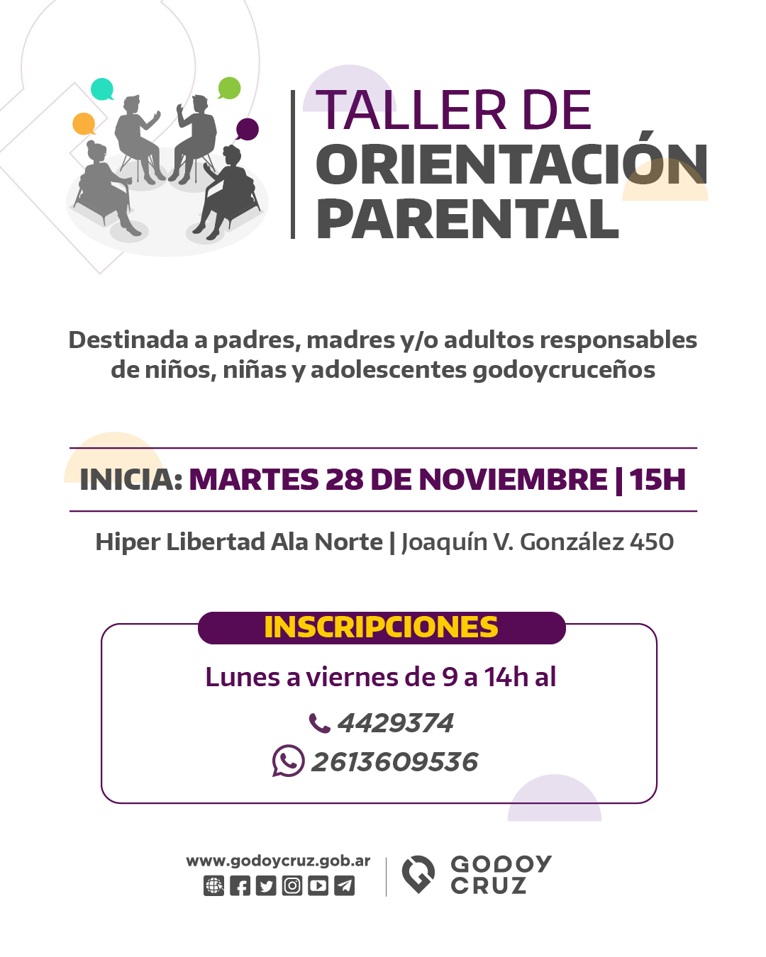 Consta de dos encuentros grupales que se realizarán los días 28 de noviembre y 5 de diciembre, de 15 a 17. Asimismo, está destinado a padres, madres y/o adultos responsables de niños y adolescentes. Las personas interesadas deberán inscribirse de lunes a viernes, de 9 a 14. Podrán hacerlo por teléfono, al 4429374 o por mensaje al WhatsApp 2613609536.